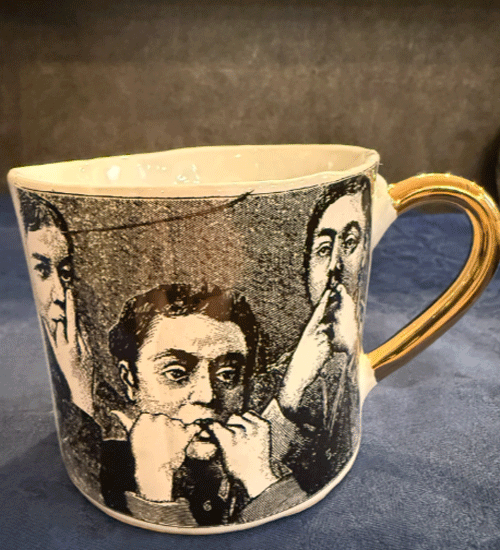 持ち手がゴールドのマグカップ。