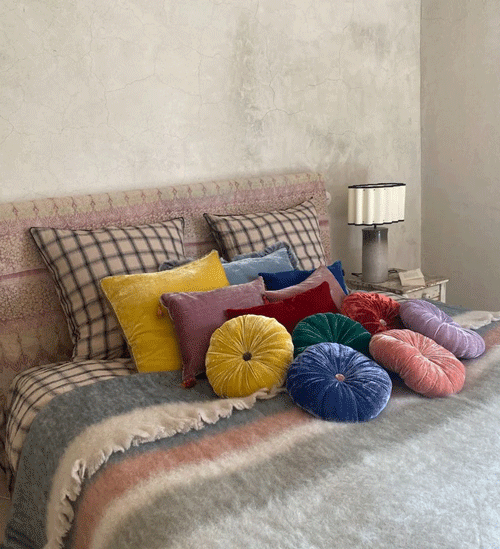 丸く愛らしい形が魅力的なシルクベルベットのクッションです。
