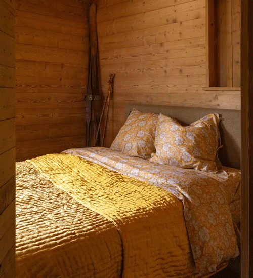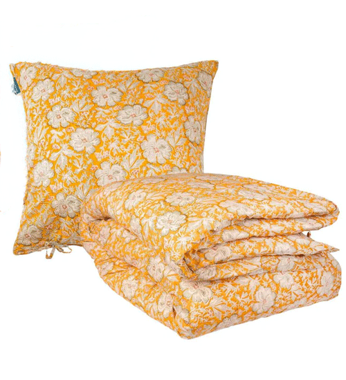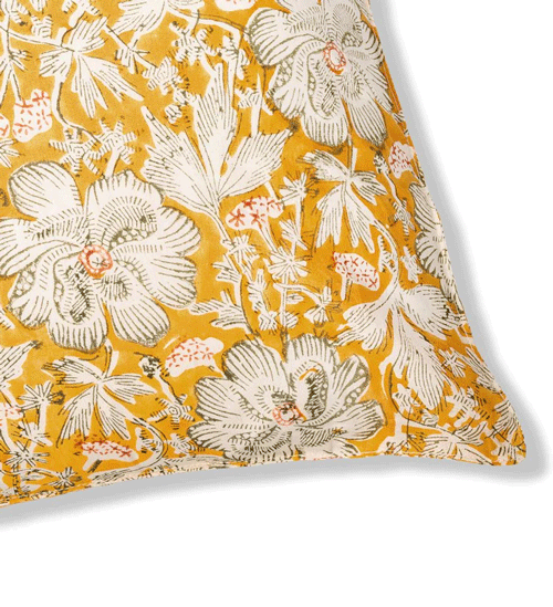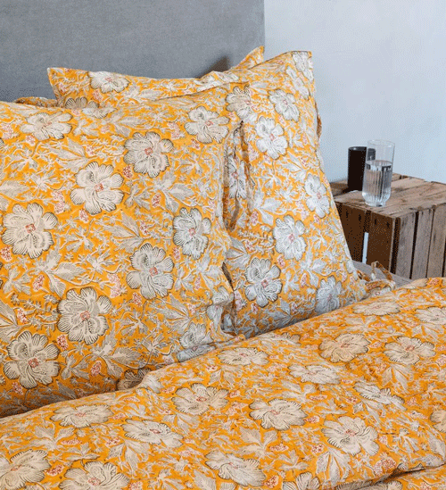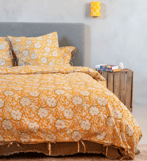 手作業のブロックプリントはイエローの花模様でとても華やかなデザイン