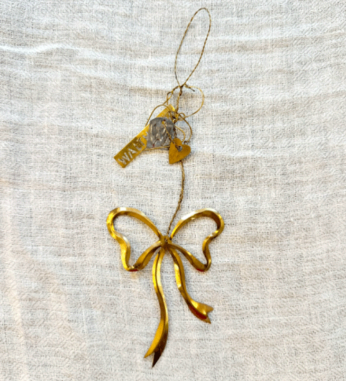 ブリキ製でゴールドのリボンの形をしており、存在感のあるデザインが魅力的です。