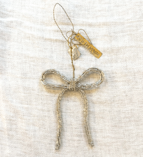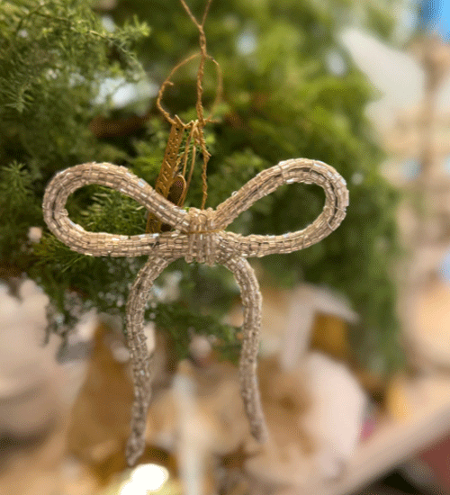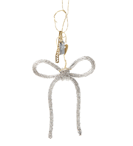 リボン型のデザインにキラキラと輝くシルバービーズがあしらわれ、華やかで上品な雰囲気を演出します。