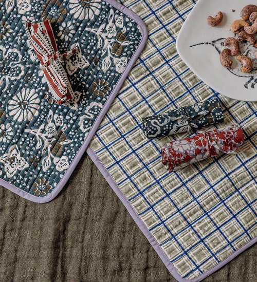 キルト仕上げでブロックプリントされたデザインが美しく、どんなテーブルにも映えること間違いなしです。